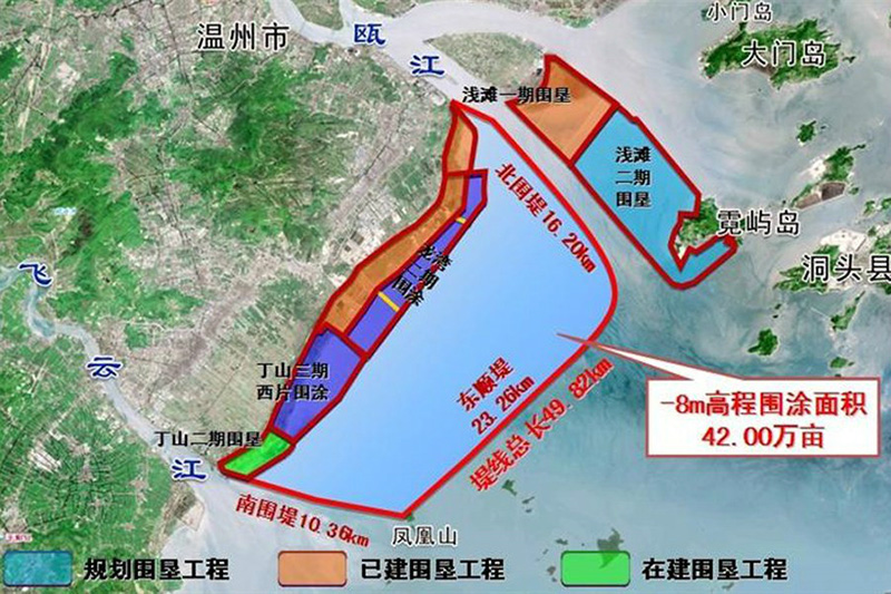 溫州市甌飛一期圍墾工程是全國單體最大的圍墾工程,位于溫州市甌江與飛云江之間甌飛灘區(qū)域,東鄰東海。圍涂區(qū)面積13.28萬畝,海堤總長36.66km,工程為Ⅰ等工程,浙江省重點工程,主要建筑物均為1級建筑物,主要工程設計壽命100年。